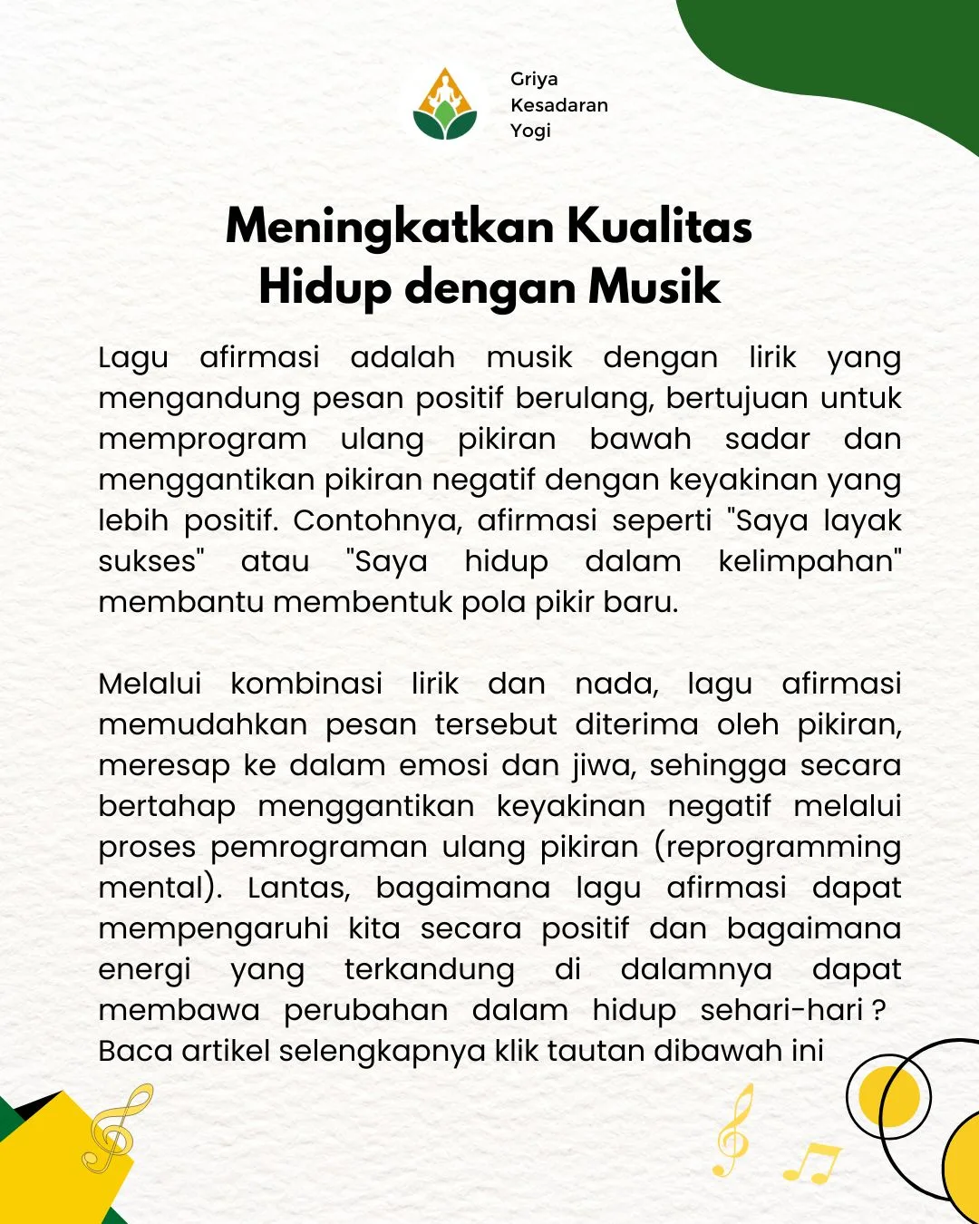 Lagu afirmasi adalah musik yang liriknya dirancang untuk menyampaikan pesan positif secara berulang. Ketika afirmasi ini dikemas dalam bentuk musik, pesannya menjadi lebih mudah diterima oleh pikiran kita, karena musik...